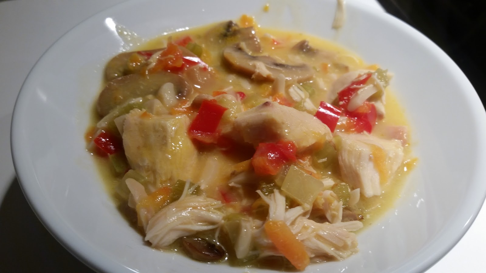 extra-large bowl, stir together chicken, celery, carrots, sweet pepper,